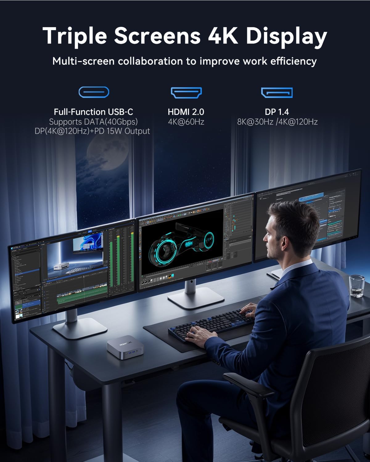 [ULTRA-FAST CONNECTIVITY USB4 &WIFI 6E, 2.5G LAN, TRIPLE DISPLAY] Equipped with WiFi 6E, Bluetooth 5.2, and a 2.5GbE LAN port—delivering lag - free online meetings and stable high - speed networking for this mini pc. Its USB4 port takes performance further: boasting up to 40Gbps transfer speeds, it moves a 3GB 4K video in just 1 second and unlocks seamless connections with Thunderbolt 3/4 devices, high - speed NVMe SSDs, or even eGPUs for boosted performance. It also supports DisplayPort Alt - Mode, letting you drive a 4K 60Hz monitor directly—paired with other video ports, this enables triple display output for expanded multitasking on the mini pc windows 11.