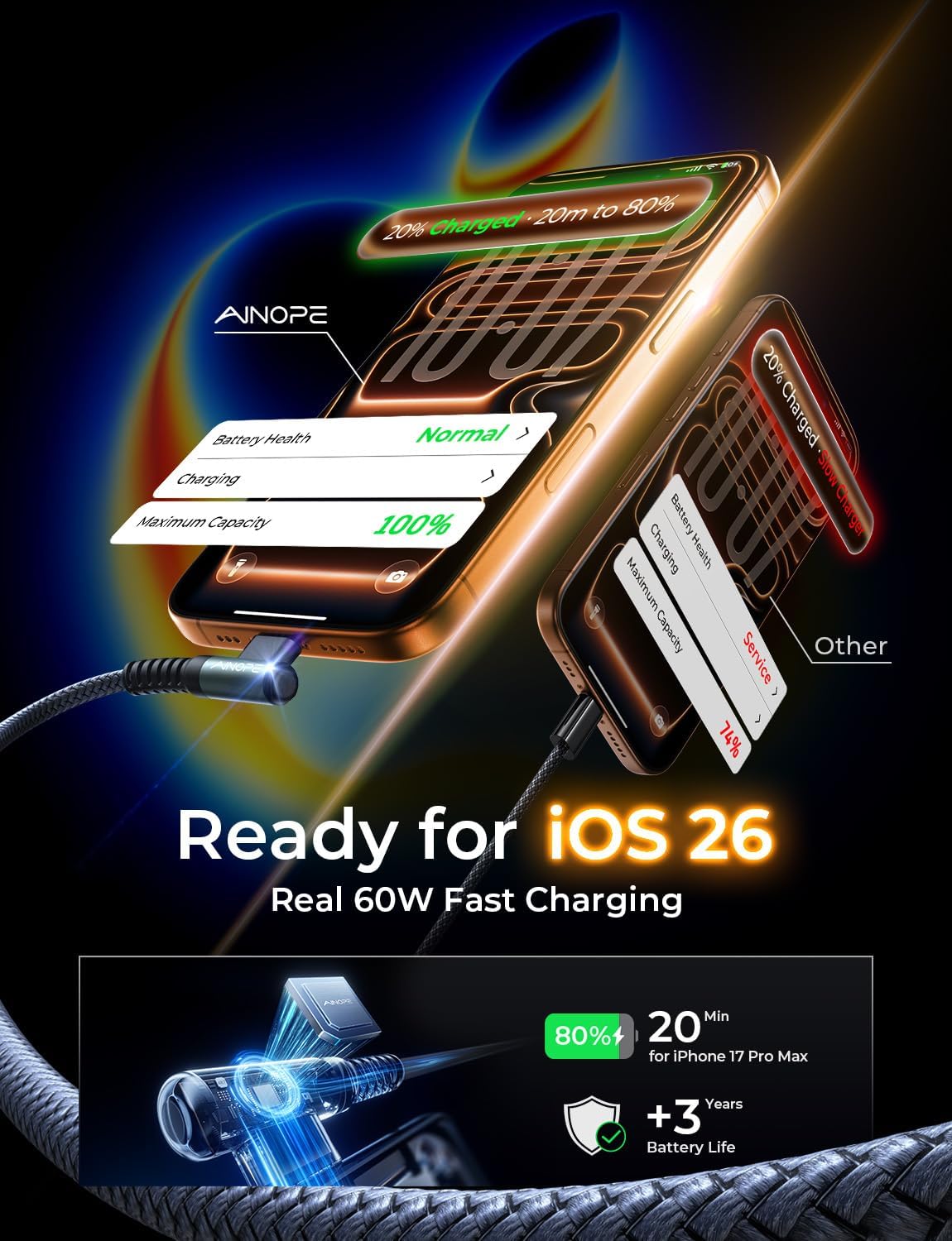 400,000+ BENDING TEST & MILITARY GRADE: While others offer 10,000-bend durability, AINOPE sets a new standard with a 400,000+ bending lifespan. Reinforced 90 degree end military-grade nylon braided iPhone 17 pro max charging cable fast charger usb c with special SR joint, Lasts 30x longer than ordinary cables-proven in a laboratory environment to withstand 400,000 bends. It built-in laser welding technology, which ensure the metal part won't break. One of the toughest c type charger fast charging type c cord ever created, with tensile strength capable of withstanding 175 lbs. It's built to outlast your device, effectively ending the cycle of frequent cable replacements.