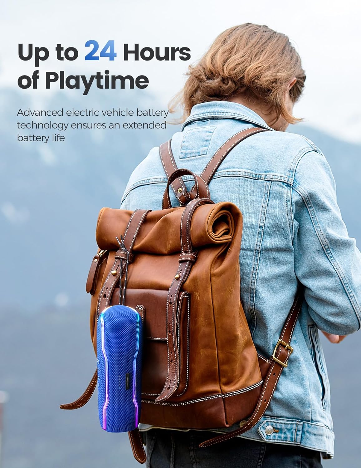[Bluetooth 5.3 & Up to 24 Hours Playtime] Bluetooth 5.3 provides incredible wireless Bluetooth range of up to 100 feet from your device. And this portable wireless Bluetooth speaker lasts all day long with up to 24 hours of playtime per charge. You can turn on/off the multi-color lights by click the "Light Button" on the surface to suit your needs and extend the battery life. The actual playtime varies by volume level, audio content, and use