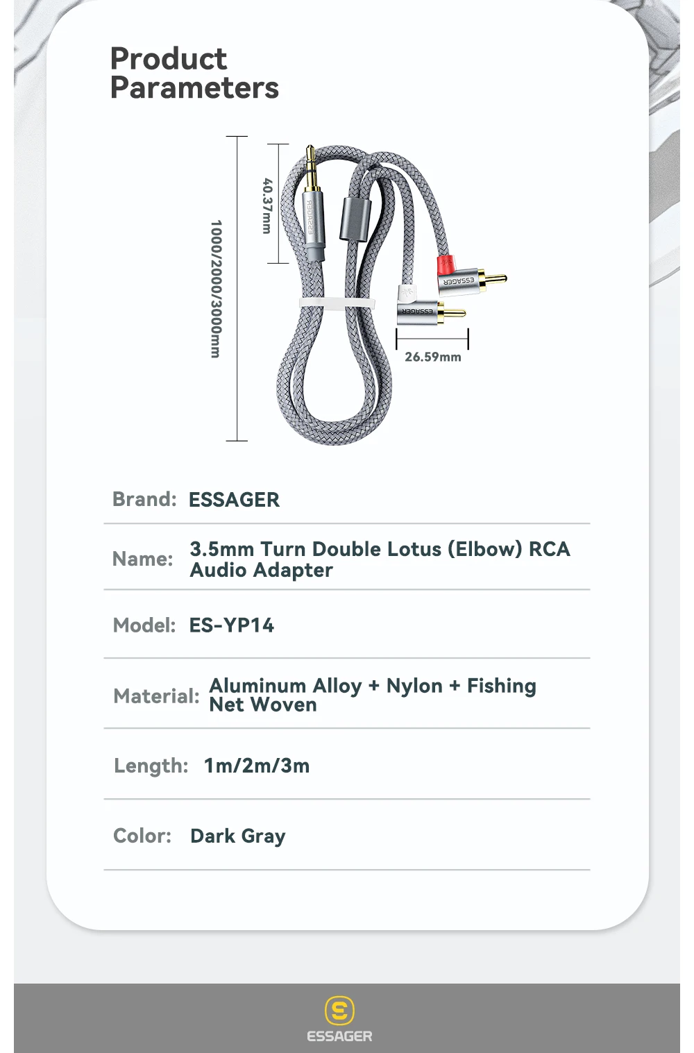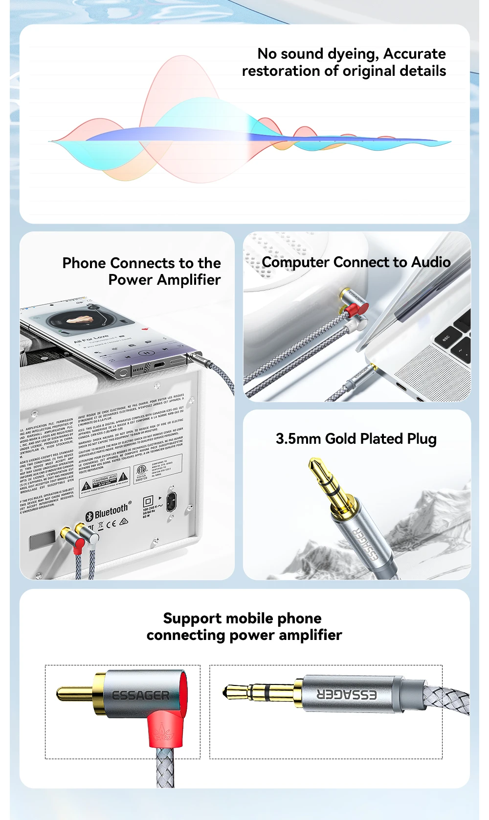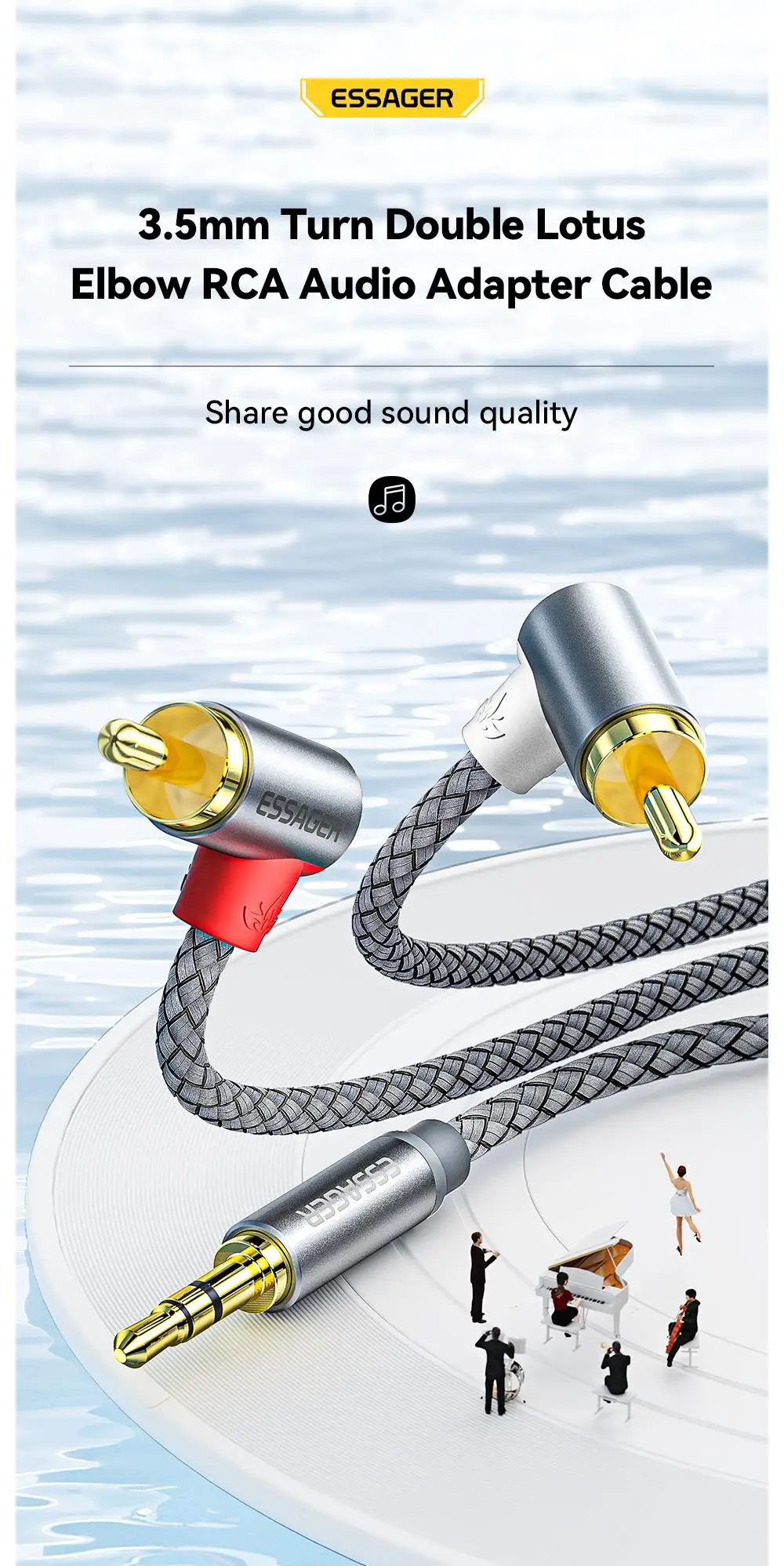 Essager’s angled RCA splitter cable connects 3.5mm headphone jacks to dual RCA inputs, perfect for tight spaces behind TVs, amps, or soundbars in home theater setups.