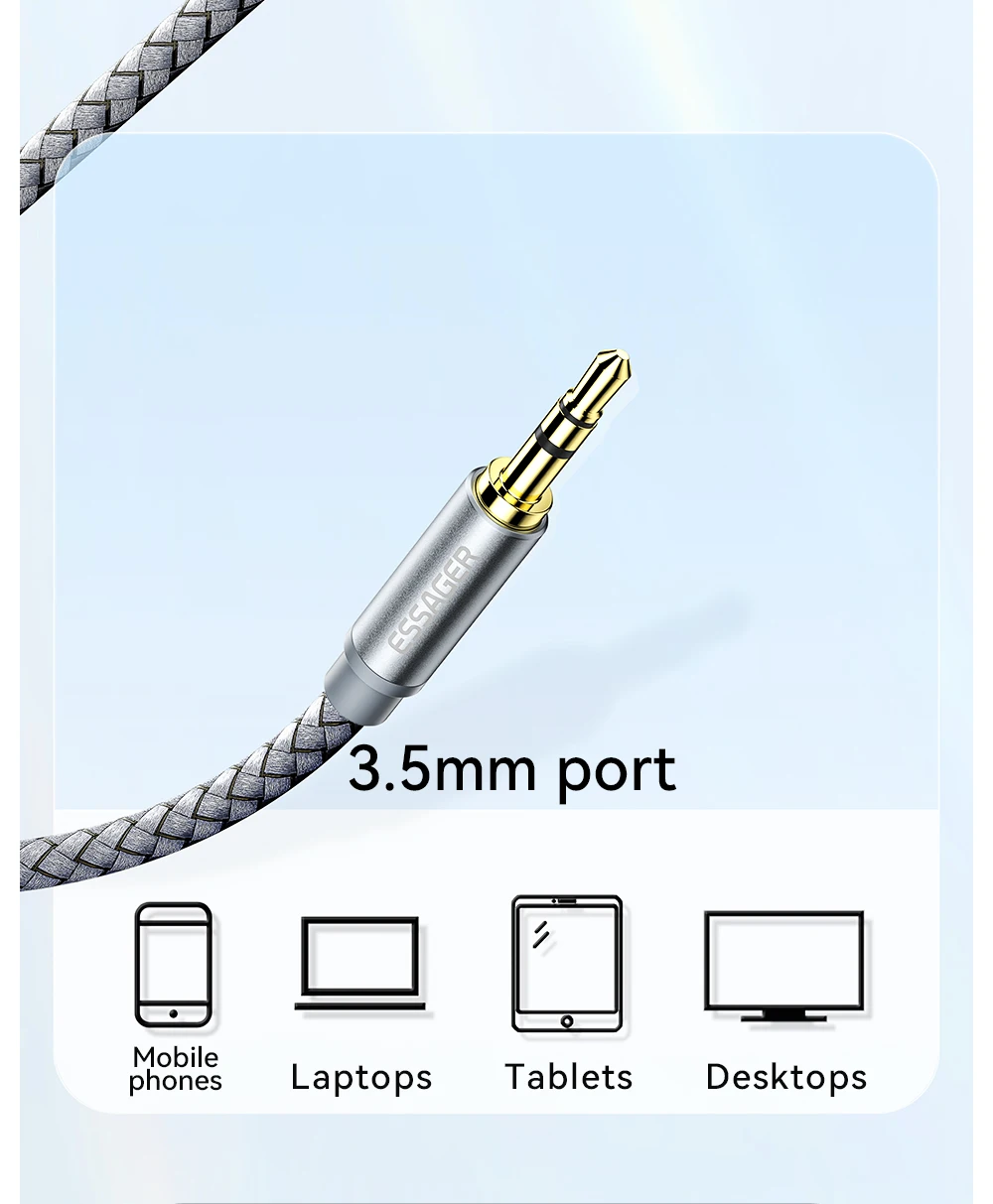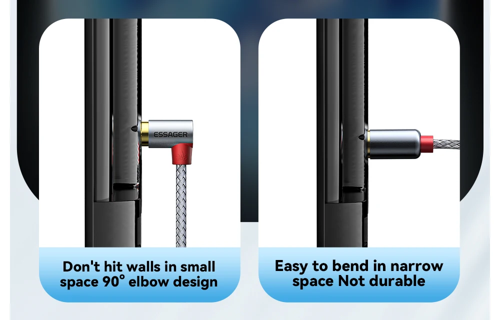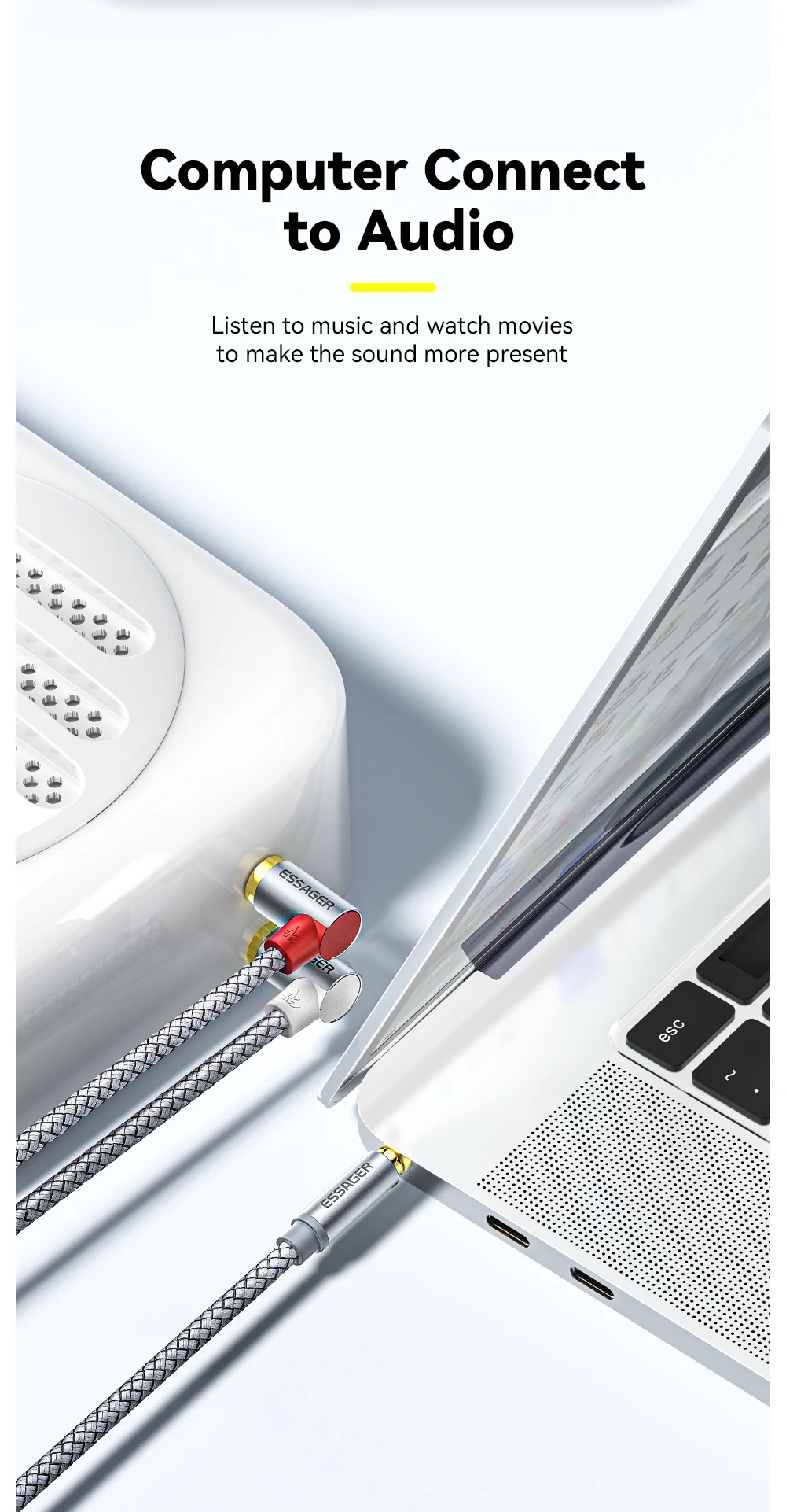 Essager’s angled RCA splitter cable connects 3.5mm headphone jacks to dual RCA inputs, perfect for tight spaces behind TVs, amps, or soundbars in home theater setups.
