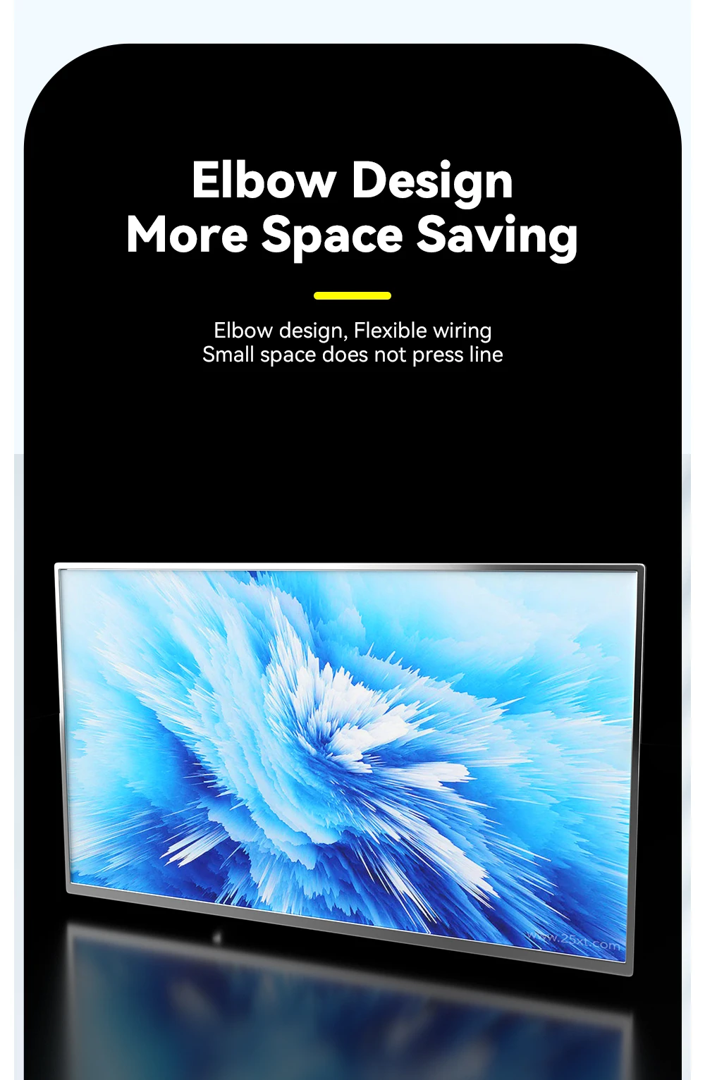 • Space-Saving 90° Design: Right-angle connectors prevent cable strain on wall-mounted devices or crowded AV racks.