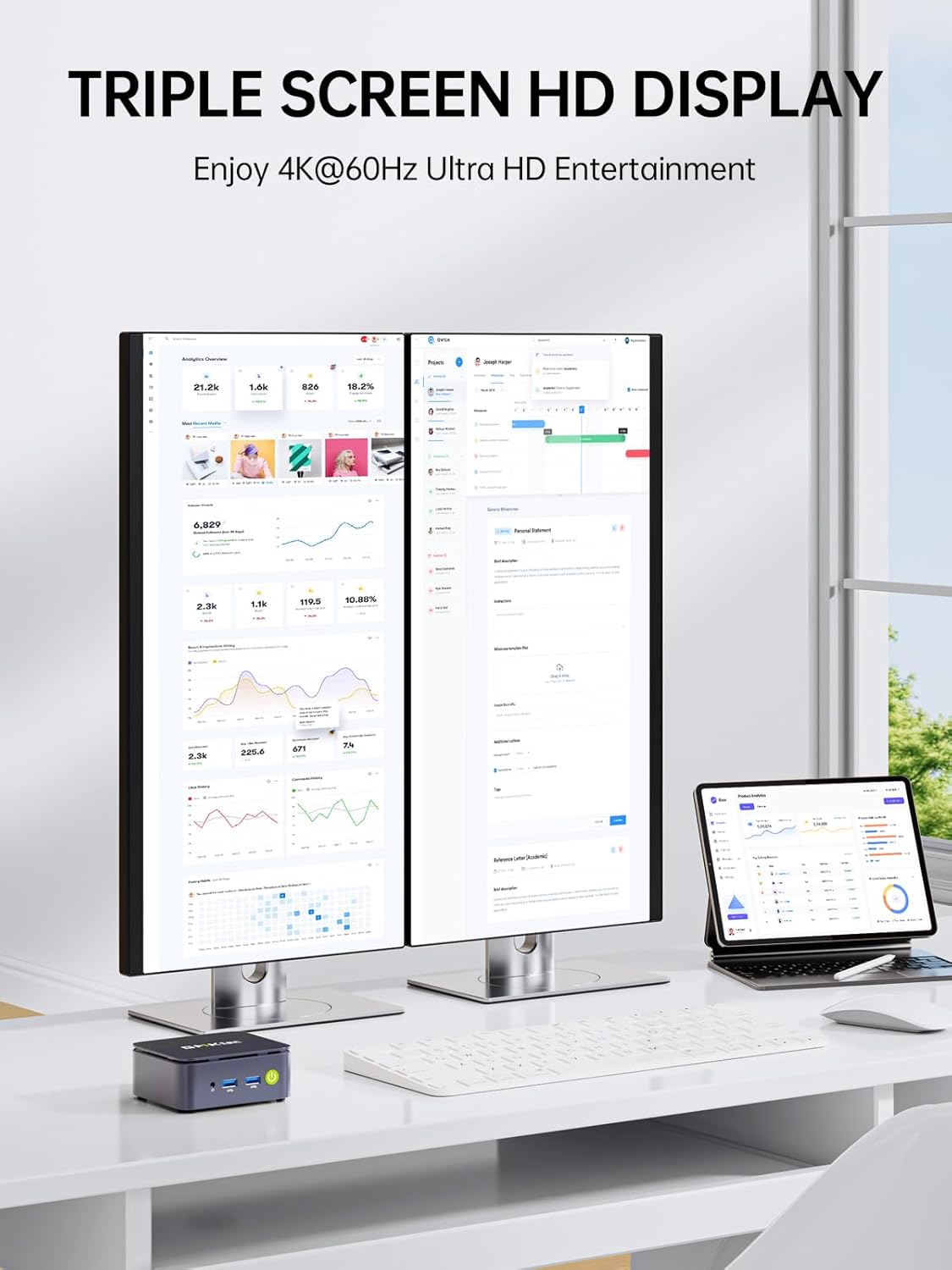 SMOOTH TRIPLE 4K@60Hz DISPLAY OUTPUT --- Supports triple-display setup via HDMI 2.1 TMDS, DisplayPort 1.4, and USB-C. The Radeon Vega 8 GPU handles 4K@60Hz video editing, office visuals, and casual design tasks smoothly. Ideal for financial trading, productivity dashboards, and multi-window workflows.