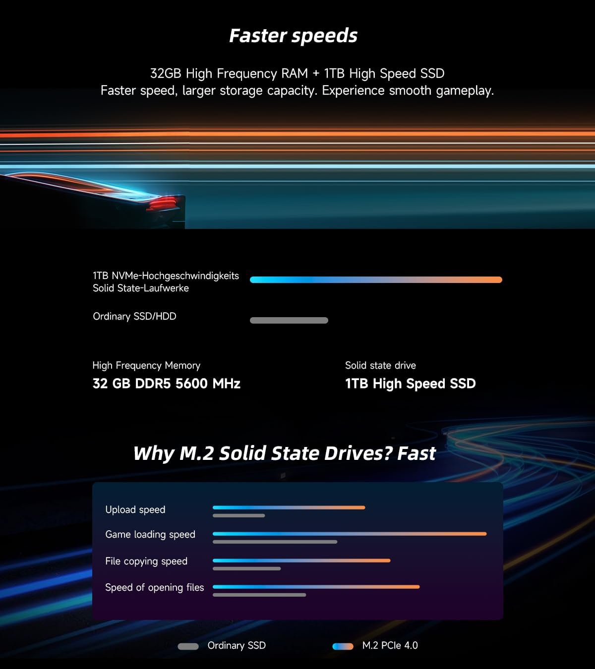 1TB high-speed solid-state drive for lightning-fast boot-up and loading: boot up in seconds and load games faster than ever! Massive storage space accommodates multiple game libraries or vast design assets, with project file transfers and software launches so fast you won't believe it—no waiting for work or entertainment!