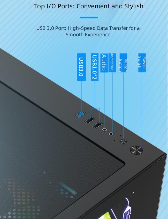 Crafted from SPCC steel and tempered glass, it showcases your powerful build in stunning clarity while ensuring durability and stability. The water-cooling support maintains peak thermal performance during intensive gaming or creative workloads, while the top-mounted power supply keeps interior wiring clean and organized.